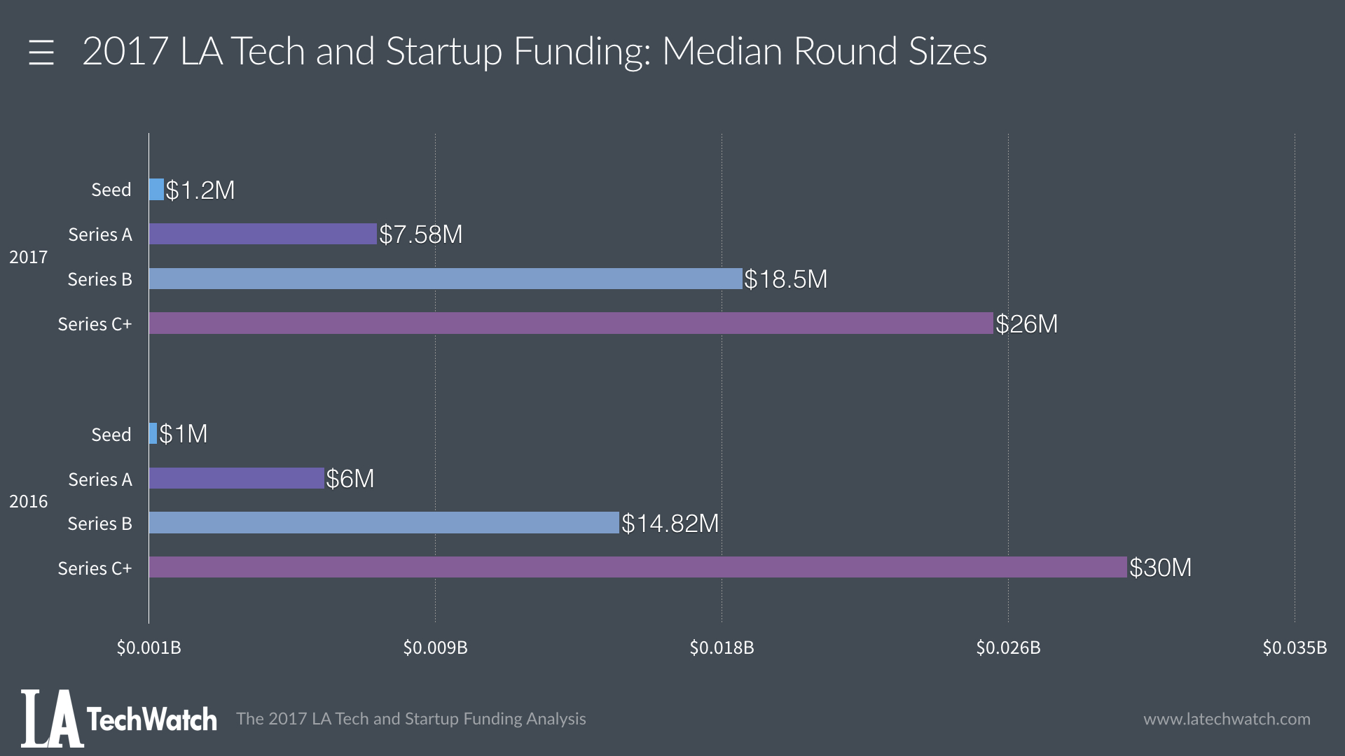The median round size across every stage in Los Angeles increased in 2017 with the sole exception being at the late stage where Series C+ gains fell from $30M in 2016 to $26M in 2017.