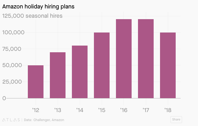 As more stagnant real estate is transformed into bustling e-commerce hubs, hiring skilled labor is becoming increasingly more challenging. In the words of labor-management executive, Peter Schnorbach, “It used to be that every month, businesses would get rid of their bottom 10% and replace them with new people. That doesn’t work anymore, because you can’t replace them.” Ever since its buyout of Kiva Systems, Amazon has been actively transforming its workforce from human hands to mechanical ones. Today, the trillion-dollar company employs more than 100,000 robots at 175 distribution centers nationwide. According to labor statistics, the retailer’s seasonal staff in 2016 and 2017 was 120,000 and 150,000 workers, respectively. In 2018 that number dropped to around 100,000 and many predict it could decline further in 2019, even though this year’s holiday online spending is estimated to soar to over $140 billion (up 14%).